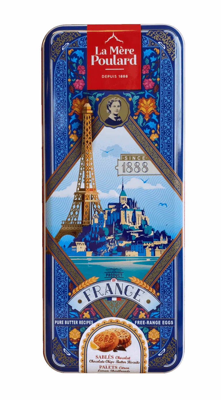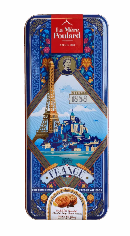 Ingrédients : Farine de blé (France), beurre (UE) (23%), sucre, pâte de citron (5%) (écorces de citron, sirop de glucose-fructose, sucre, correcteur d’acidité : acide citrique), oeufs (2,6%), jaunes d’oeufs en poudre (1,3%), arôme naturel de citron (0,8%), sel.Palet citron :