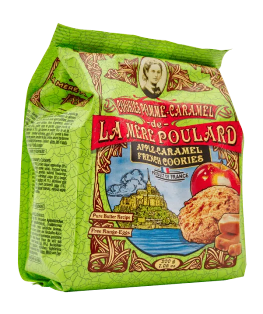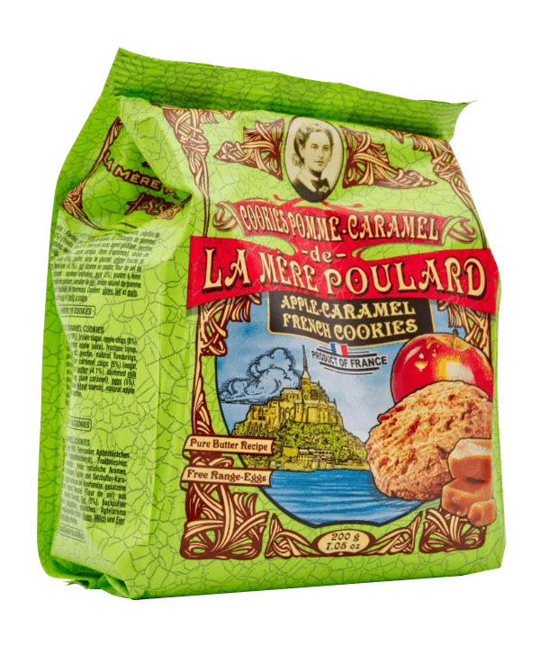 pur beurre, oeufs plein airFarine de blé (France), beurre (UE) (19%), cassonade, pépites de pomme (8%) (fruits (purée concentrée de pomme, jus concentré de pomme), sirop de fructose, sucre, farine de riz, beurre de cacao, agent gélifiant : pectine, arômes naturels, acidifiant : acide citrique, fibres d’agrumes), éclats de caramel au beurre salé (5%) (sucre, sirop de glucose, crème fraîche de Normandie, beurre demi-sel (4,1%), lait écrémé en poudre, fleur de sel de Guérande (1,6%), colorant : caramel ordinaire), oeufs (5%), poudre à lever (diphosphates, carbonate de sodium, amidon de blé), arôme naturel de pomme (0,4%), sel, émulsifiant : lécithine de tournesol.